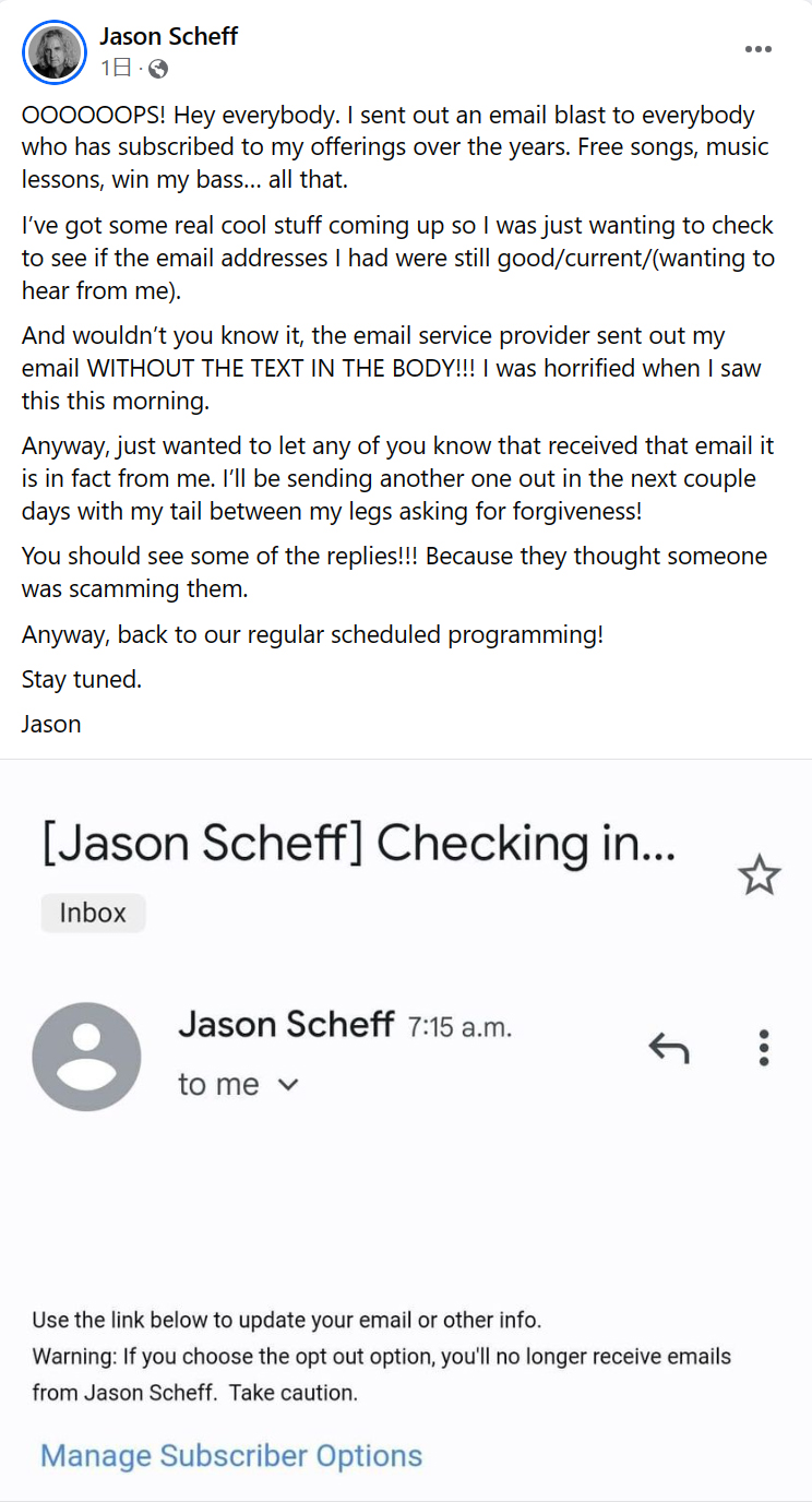 ジェイソン・シェフは、日本時間の2023年9月22日、自身のウェブサイトに登録されたファンのメールアドレス向けに、現在も該当アドレスが使用できるのか、確認するメールを一斉送信しました。