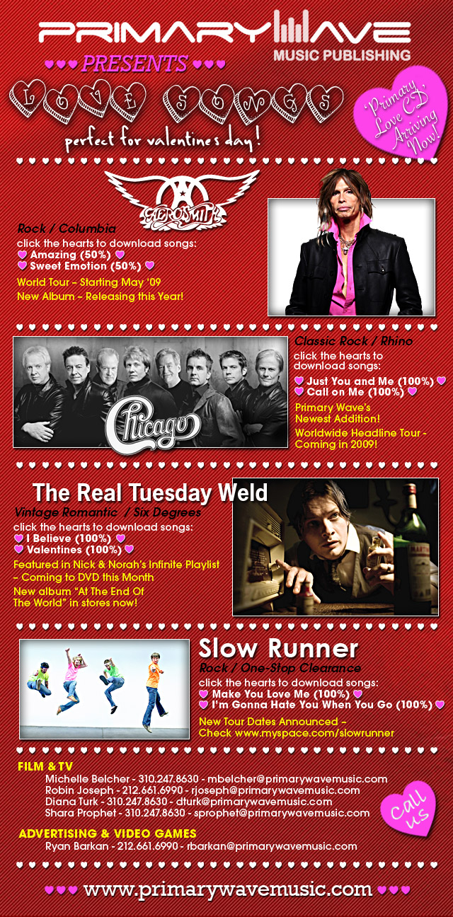 プライマリー・ウェイヴは、音楽出版権を得たことになり、ロバート・ラム、リー・ロックネイン、ジェイムズ・パンコウの曲を市場に売り出すことになるだろう。彼らの作曲にかかるものは、70年代のヒット曲で、"MAKE ME SMILE"、"SATURDAY IN THE PARK"、"DOES ANYBODY REALLY KNOW WHAT TIME IT IS?"、"COLOUR MY WORLD"、"JUST YOU 'N' ME"、"FEELIN' STRONGER EVERY DAY"、"CALL ON ME"、"BEGINNINGS"などがある。